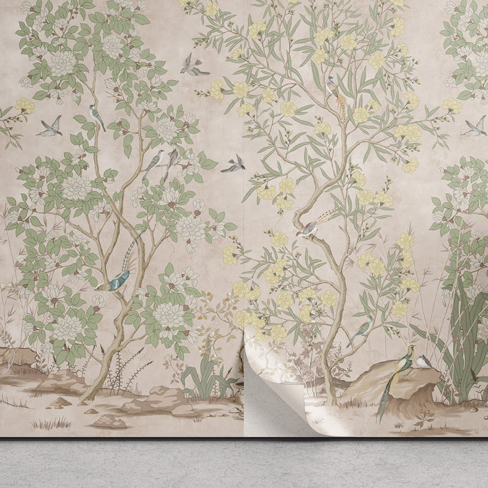 Add refined elegance to your walls with our Chinoiserie peel & stick wallpaper in a warm beige tone, featuring graceful birds, blossoms and soft foliage in a timeless toile design. This removable mural is perfect for bedrooms, powder rooms, nurseries or feature walls in rental spaces, with effortless application and clean removal. Printed on premium materials with eco-friendly inks, it offers stunning style without the fuss—and customization is available for size & pattern scale. Whether you’re decorating a nursery, guest room or sophisticated living space, this bird & blossom garden design creates serene charm and elevated character.