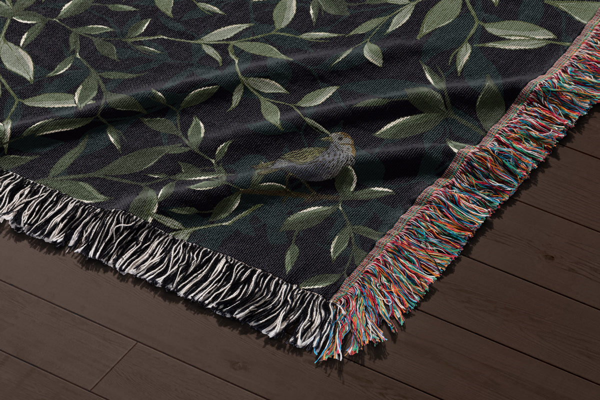 Green Leafy Throw Blanket - Nature-Inspired Dark Botanical Tapestry, Birds and Leaves Woven Bedspread